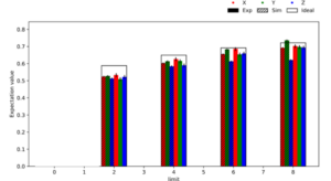 The left side of the following figure shows the expectation values for the actual run on Quantinuum H1-1 system, as well as the results of a simulation run of the H1-1 emulator (denoted as H1-1E). We plot the expectations with respect to three different Pauli frames X, Y, and Z which completely characterize the state of the qubits. The boxes indicate the ideal result which is only achievable for gates that are completely noiseless. The right side of the figure shows the probability of distillation succeeding at different limits, running both on the H1-1 system and the H1-1E emulator. The dashed black line indicates the probability of success expected for a perfect state preparation on a noiseless device.